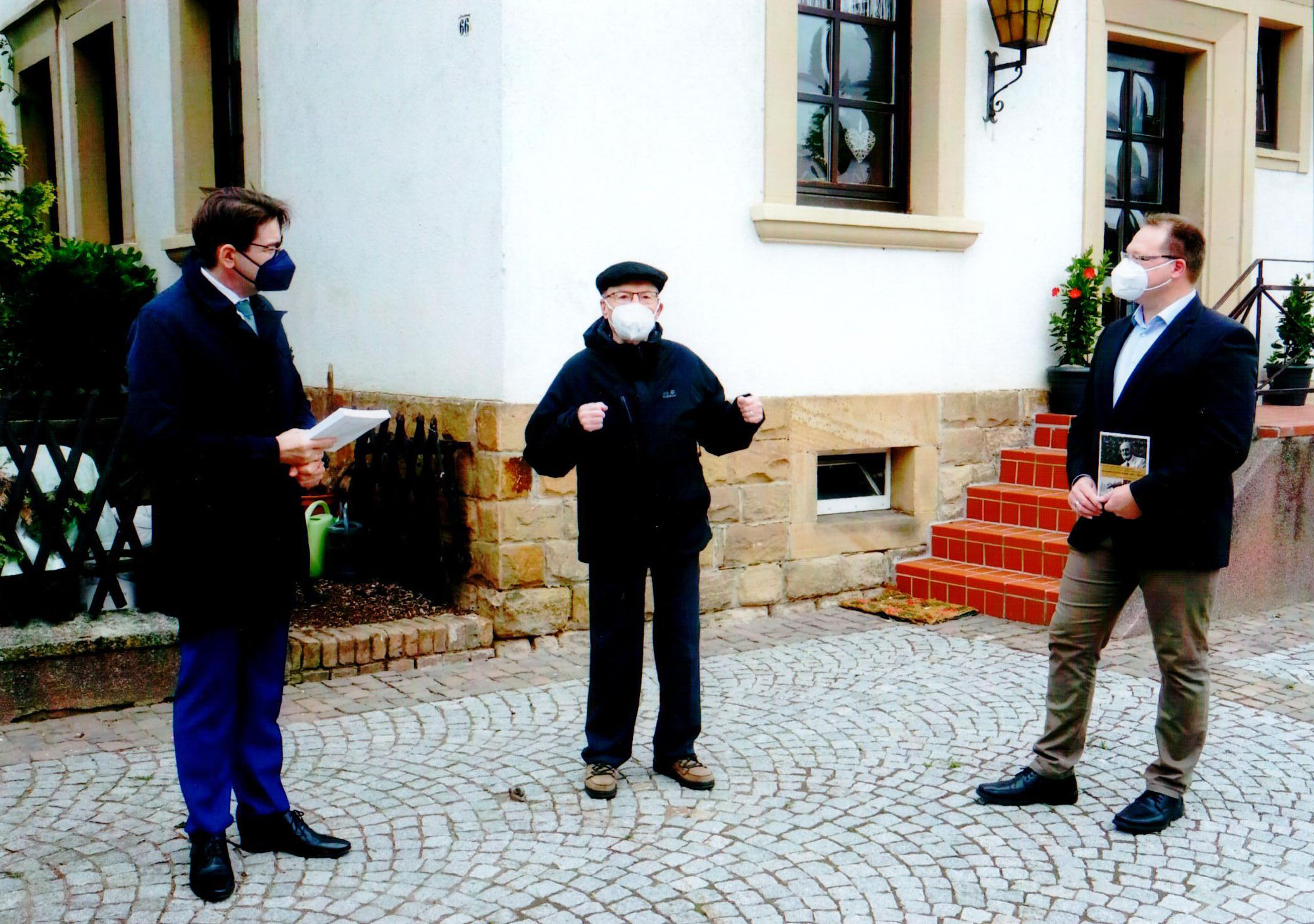 Anbringung einer Gedenktafel für Richard Rudolf Klein an seinem 100. Geburtstag durch den Oberbürgermeister Thomas Hirsch, den Landrat Dietmar Seefeldt, den Ortsvorsteher Thorsten Sögding sowie dem Biograph Hermann-Josef Hilbert